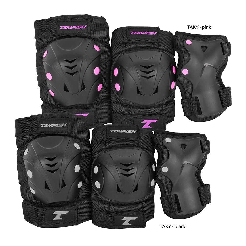 3 sada chráničů TEMPISH TAKY pro bruslaře zajistí bezpečnou ochranu základních částí lidského těla, kde dochází nejčastěji k poraněním (kromě hlavy - přilby). Set se skládá z chrániče zápěstí, kolen a loktů. Chránič zápěstí má plastickou výztuhu, která chrání zápěstí z vnitřní strany proti poranění. Vnitřní část všech chráničů je ušita z jemné textilie, která dobře saje vlhkost (pot) a jemně klouže po kůži. Chránič zápěstí se pevně připevní za pomocí tenčího pásku na dlani a širšího pásku na zápěstí s nášivkou s logem TEMPISH. Plastická skořepina chráničů kolen a loktů je velmi houževnatá a má perfektní anatomický tvar, který zajistí stabilní polohu chrániče, pohodlnou funkci při bruslení a pohybu a vysokou míru ochrany při pádu. K textilní části chrániče je pevně připevněna 3-mi páry nýtů. Textilní část chrániče se skládá ze tří částí: první část je připevněna pomocí elastického pásku ke končetině nad kloubem a pohybuje se společně s ní druhá část chrániče je umístěna přímo na kloubu a chrání jej v případě nárazu třetí část chrániče je připevněna elastickým páskem ke končetině pod kloubem a pohybuje se společně s částí končetiny pod kloubem Touto konstrukcí je zajištěna velká volnost pohybu a chránič minimálně omezuje pohyb. Uživatel po krátké chvíli přestane vnímat, že nějaký chránič má, neboť se přirozeně přizpůsobuje tak, jak se bruslař pohybuje. Chrániče jsou vybaveny punčoškou, která chránič podrží ve správné poloze kdyby náhodou došlo při pádu k uvolnění pásku a také tlumí tlak pásku na kůži. Chrániče jsou v nenápadné, konzervativní černé barvě, pouze s malými barevnými doplňky.