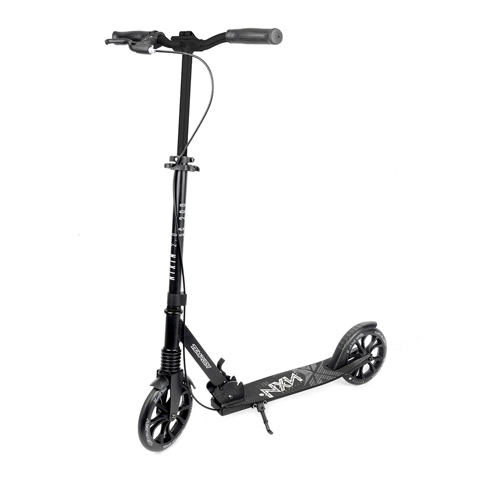 Pro hladkou jízdu i na nerovném povrchu je koloběžka vybavena předním odpružením, zatímco snížená deska pomáhá s efektivnějším odrážením a menší únavou nohou. Brzdění je možné dvěma způsoby – přítlačnou páčkovou brzdou na zadní kolo (s nastavitelnou páčkou i pro kratší prsty) nebo klasickou nášlapnou brzdou přes zadní blatník.