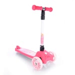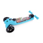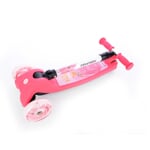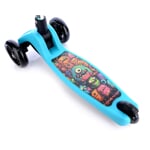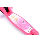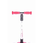 Bezpečná koloběžka pro děti od 3 let. Velmi jednoduchý skládací systém na 1 tlačítko. Nastavitelná výška řídítek ve 4 polohách: 56 cm, 61 cm, 66 cm, 71cm. Koloběžka je velmi stabilní kvůli použití 3 koleček. Velmi jednoduchá na ovládání – přenášení váhy na stranu, čímž koloběžka zatáčí. Deska má užitnou plochu 29 x 12 cm. Přední i zadní kolečka jsou osvětlena LED multicolor světly.