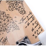 Design boardu je inspirován old-school instinkty, tudíž jen dřevo, jednoduchý černý design, raw hliníkové trucky a bílá kolečka s decentním potiskem.