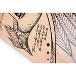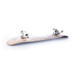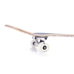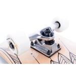 Design boardu je inspirován old-school instinkty, tudíž jen dřevo, jednoduchý černý design, raw hliníkové trucky a bílá kolečka s decentním potiskem.
